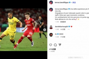 泰拉恰诺写道:“这是我人生中最重要、最有成长意义的经历之一。能够穿上这身球衣,我感到无比自豪;感谢所有队友、教练组以及球迷们,感谢与你们共同度过的每一个时刻。”